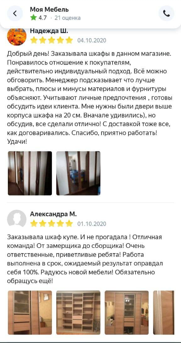 Меня зовут Марина и я уже более 15 лет работаю главным технологом на фабрике Моя Мебель. За это время мы выработали уникальную систему производства корпусной мебели без сколов и с минимальными допусками. Я с радостью помогу Вам подобрать мебель под любой интерьер и любых размеров. Наши курьеры поднимут изделие на Ваш этаж, даже если лифт не работает, а сборщики установят все за один день, без пыли и мусора.